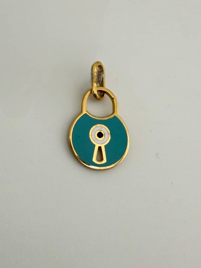 این آویز شیک و مدرن، با طراحی خاص قفل دایرهای و میناکاری فیروزهای (یا آبی تیفانی)، جلوهای رنگین و خاص به استایل شما میبخشد. طرح کلیدخور آن با جزئیات ظریف چشم مانند، آن را به نمادی از راز و زیبایی تبدیل کرده است. یک انتخاب عالی برای هدیه و استفاده روزمره.